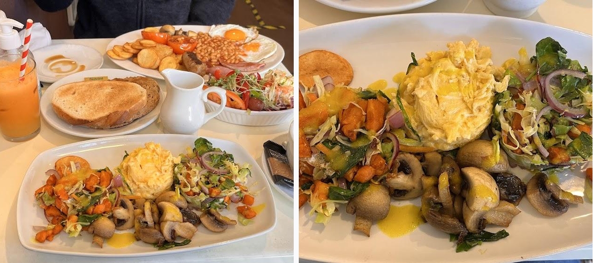First time visiting and we will definitely return next time we visit. I had the standard breakfast that came with 2 eggs, 2 bacon, 2 tomatoes, sausage, beans, fried bread and toast whilst my husband the full monty (pictured) we both had a juice each and out child has toasted teacake. The price for all was a little over £22.